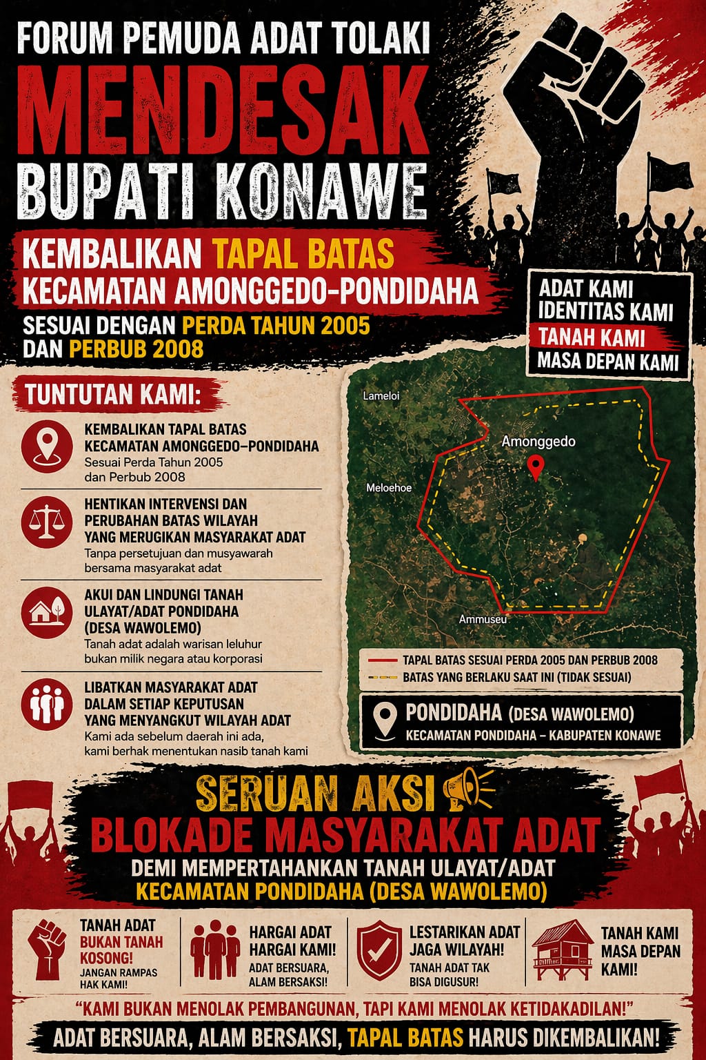 Aksi ini akibat lambannya Pemda Konawe menyelesaikan persoalan sengketa Tapal Batas di kecamatan Pondidaha dan Amonggedo. Sengketa Tapal Batas kedua kecamatan ini telah berlangsung 17 Tahun Lamanya, hingga saat ini.