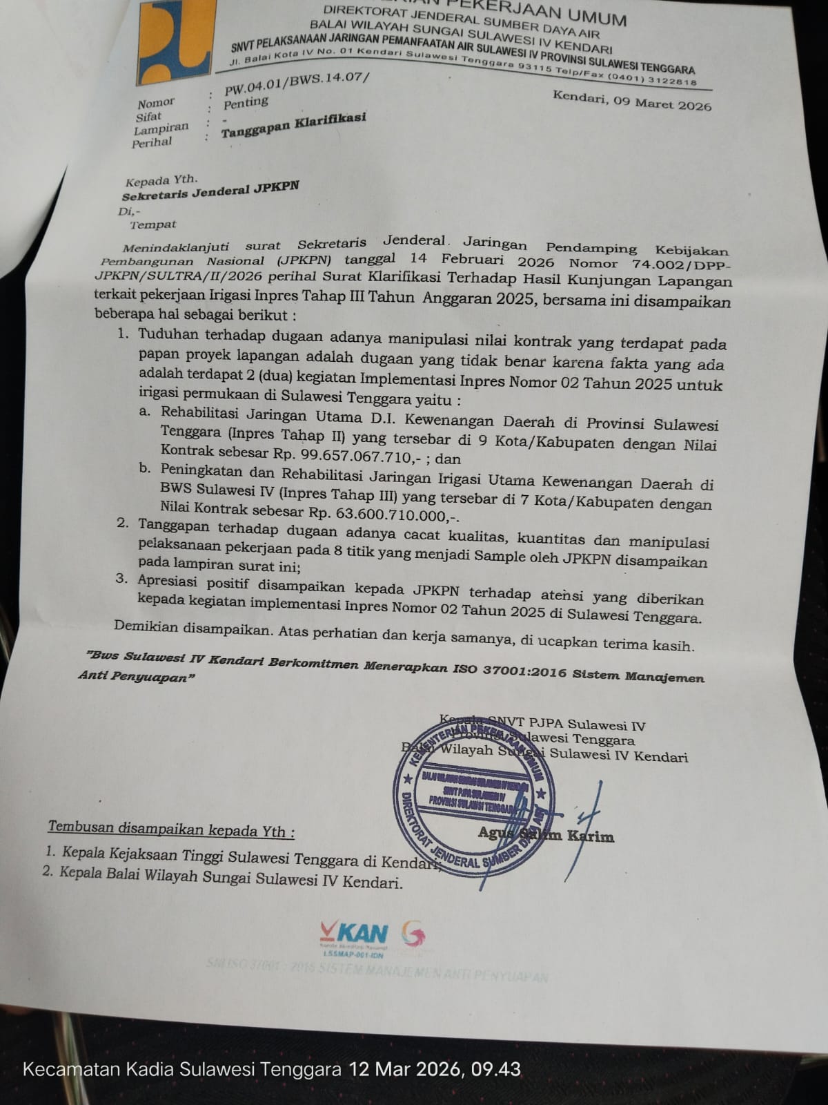 KENDARI – Jaringan Pendamping Kebijakan Pembangunan Nasional (JPKPN) secara resmi melayangkan surat sanggahan atas tanggapan klarifikasi dari Balai Wilayah Sungai (BWS) Sulawesi IV Kendari. Sanggahan ini berkaitan dengan temuan ketidakberesan pada proyek Daerah Irigasi (DI) Trimulya di Kabupaten Konawe.